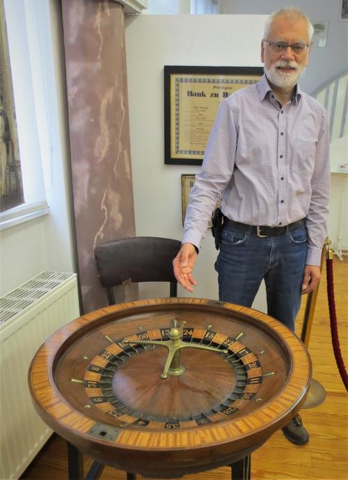 Dr Hans-Jürgen Sarholz, the retired director of the Bad Ems town archive and museum is presenting the early 19th century roulette from the Bad Ems Kursaal.