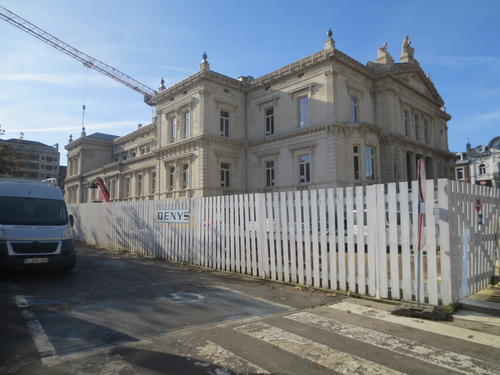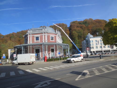 Spa: Restauration work on the pavilion at the entry to the Parc de Sept Heures. The promenade's iron and glass structure has been been removed for renovation